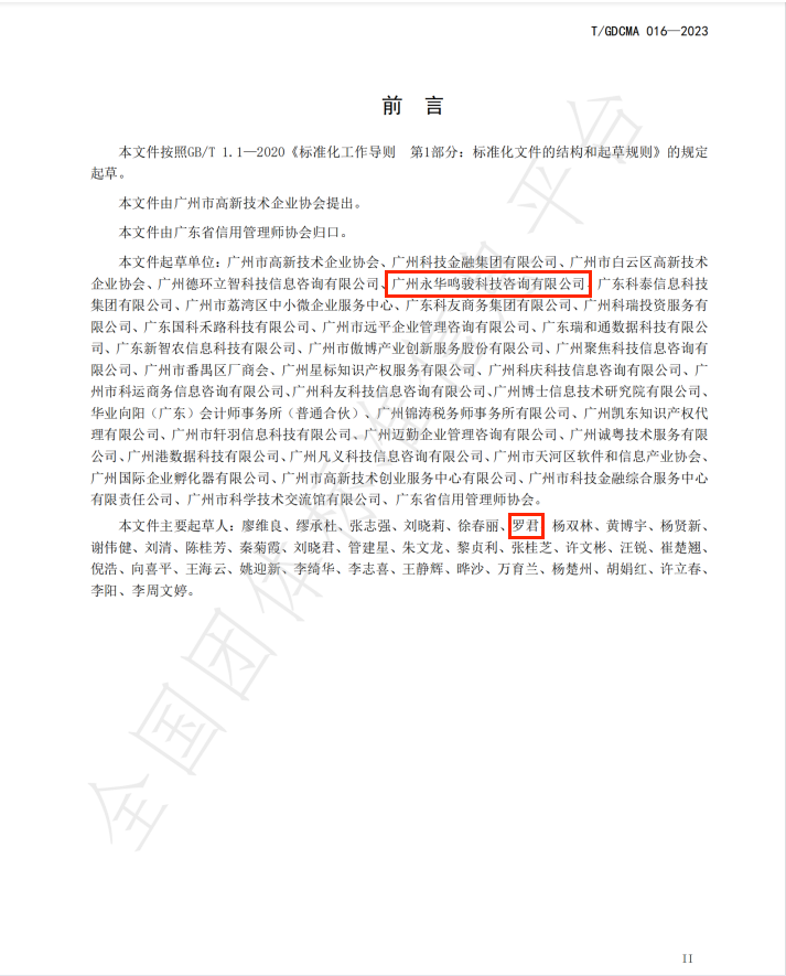 今年,广州永华鸣骏科技咨询有限公司参与由广州市科技局指导,广州市高新技术企业协会牵头的《高新技术企业诚信服务规范》起草,助力广东高企服务主体诚信服务体系建设。