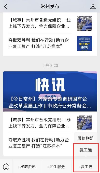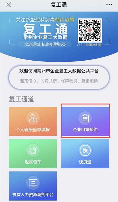 1.用户关注“常州政企通”、”常州发布“微信公众号,点击“复工通”进入“企业口罩预约”。