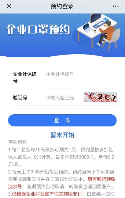 2.每天上午9:30开始接受预约,预约当天下午4:30前须完成转账支付并在口罩预约记录中填写银行转账流水号,逾期预约自动取消。