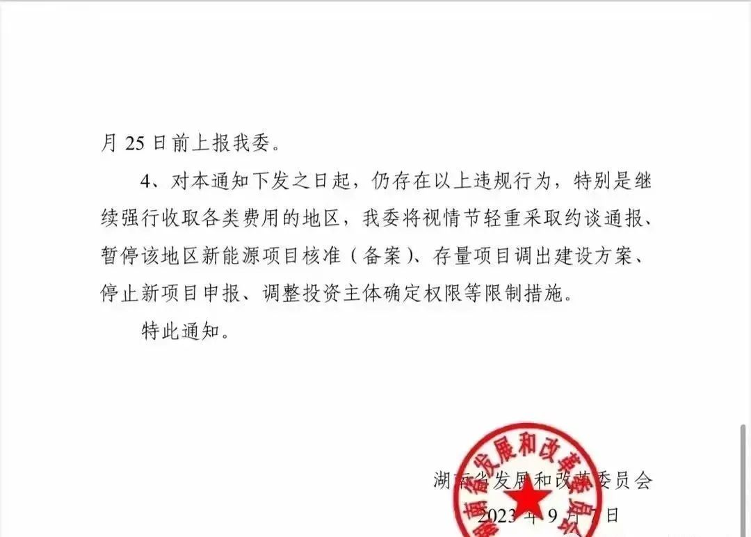 4、对本通知下发之日起,仍存在以上违规行为,特别是继续强行收取各类费用的地区,我委将视情节轻重采取约谈通报、暂停该地区新能源项目核准 (备案)、存量项目调出建设方案,停止新项目申报、调整投资主体确定权限等限制措施。