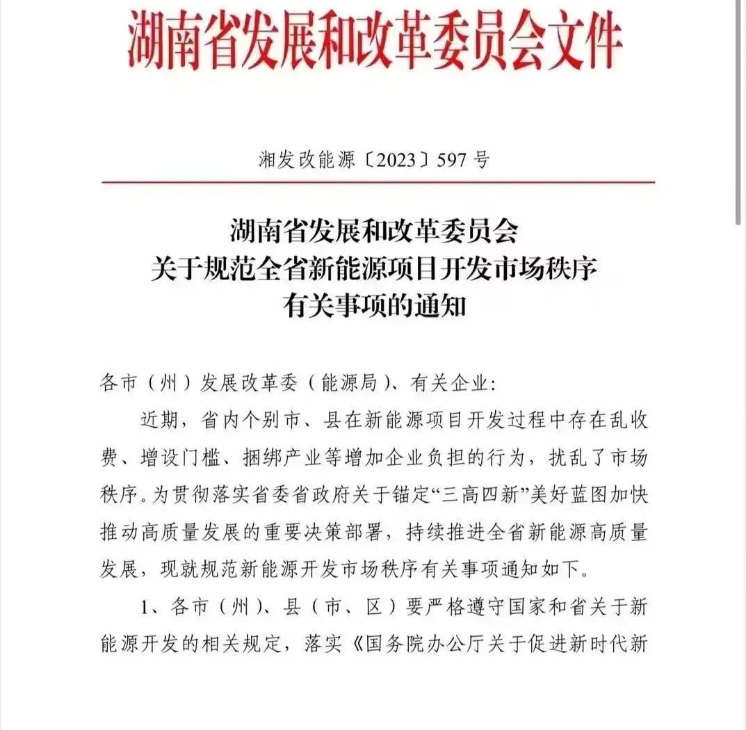 9月7日,湖南发改委发布《关于规范全省新能源项目开发市场秩序有关事项的通知》。