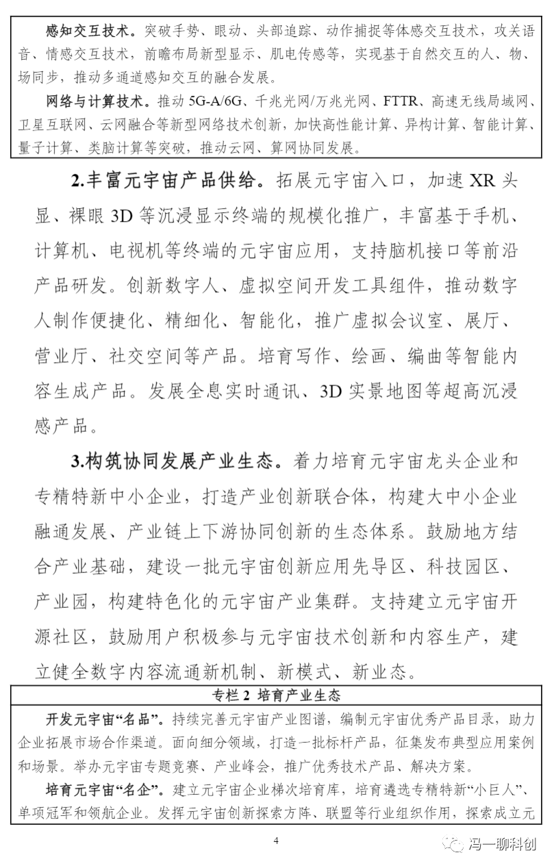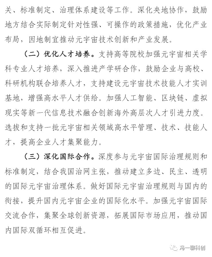 一是强化统筹协调。统筹协调各部门,加强产业、创新、财政、金融、区域等政策协同。深化央地协作,鼓励地方结合实际制定针对性强、可操作的政策措施,优化产业布局。二是优化人才培养。包括支持高等院校加强元宇宙相关学科专业人才培养,鼓励企业与高校、科研机构联合培养人才,支持建设元宇宙技能技术人才实训基地,加大海外高层次人才引进力度等。三是深化国际合作。深度参与元宇宙国际治理规则和标准制定,做好国际元宇宙治理规则与国内的衔接,推动建立多边、民主、透明的国际元宇宙治理体系。加强元宇宙国际交流合作,推动国内国际双循环相互促进。