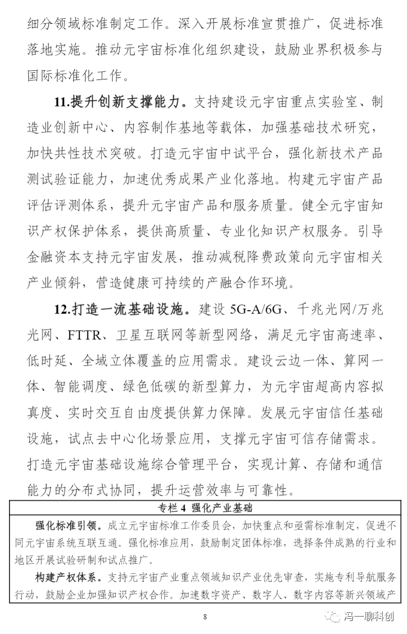 《行动计划》从完善产业标准体系、提升创新支撑能力、打造一流基础设施三个方面提出了意见措施,重中之重的要点:一是建设元宇宙产业标准规范体系,包括产业链标准以及基础共性、互联互通、安全可信、隐私保护、行业应用等方面的国家标准、行业标准和团体标准。二是构建可信元宇宙产品评估评测体系和健全元宇宙知识产权保护体系。三是建设云边一体、算网一体、智能调度、绿色低碳的新型算力,打造元宇宙基础设施综合管理平台等。