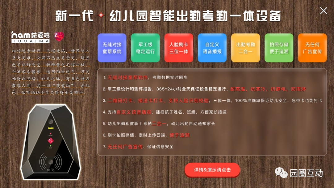 童帮智能考勤机-获爱玛,由 童帮公司—补天科技 进行设计研发的智能考勤设备,实现孩子出勤、 教职工考勤二合一,无缝对接童帮管理平台,同步高清摄像头进行抓拍推送,童帮PC端实时分析汇总考勤数据,安全把控一步到位,全方位守护孩子入学与接送安全。
