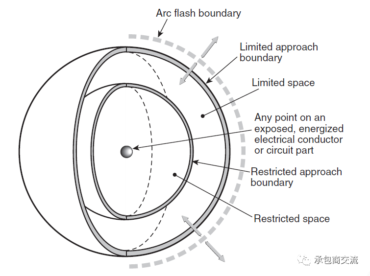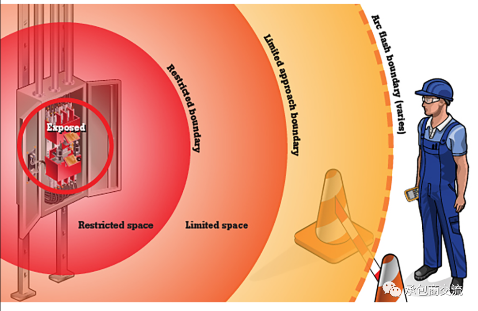 我将Restricted Approach Boundary称为限制性进入区域;实际上Limited和Restricted区域都有可能被电shock到,但Restricted区域内被shock到的机率更大。这两个定义还要结合Unqualified Person和Qualified Person来看:Limited允许未授权人员在授权人员监护下进入;Restricted是严格控制的,只允许授权人员在穿戴合适PPE情况下进入。