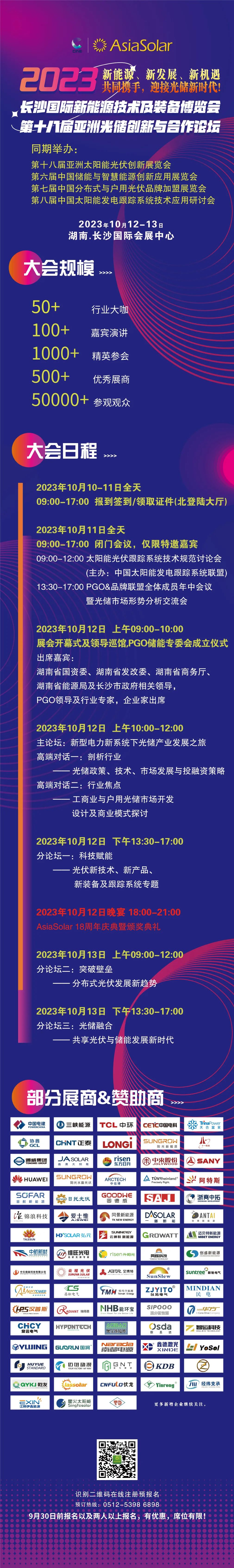 AsiaSolar第18届亚洲光储展览会暨论坛将于2023年10月12-13日在长沙国际会展中心召开,以“光储融合创新”为主题,2天展览,同期2天论坛;500家光储行业优秀企业参展,50000余名观众参观;50余位行业大咖出席同期论坛,100位嘉宾参加论坛演讲,1000多位行业专业人士参会。展会提供了了解行业趋势和建立商业关系的良好平台。