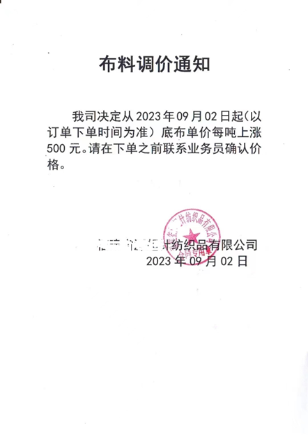面料动销或涨价是旺季到来的前兆吗?但是坯布价格微涨到底是为什么呢?通过市场调研企业的反应可以分为两点,一方面是由于旺季带动下贸易商为应对亚运停机带来的供需担忧采购囤货的情况,另一方面,来源于近日成本端的上涨带动。