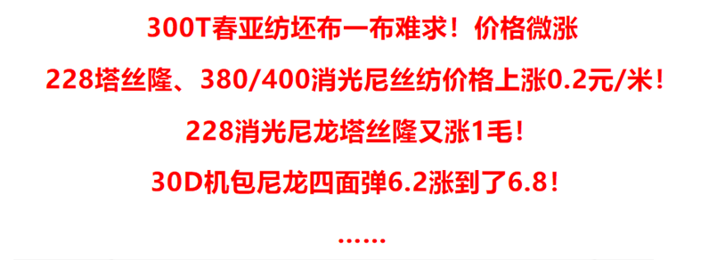 而在8月末,面料市场就出现了局部动销的现象,诸如300T春亚纺、100D四面弹、228塔丝隆等面料都有不同程度的热销。后续,因货源供应紧张等因素,部分面料报价也随之上调。