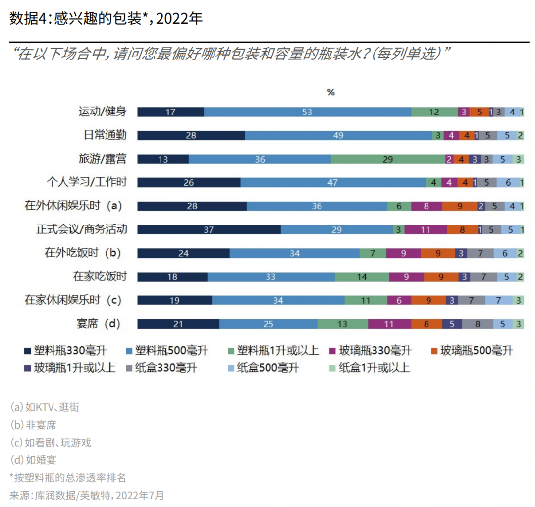 上述英敏特报告显示,无论是运动/健身、日常通勤等户外场景,还是吃饭和休闲娱乐等居家场合,塑料瓶500毫升和塑料瓶330毫升都是受访者最喜爱的前两种包装和容量。
