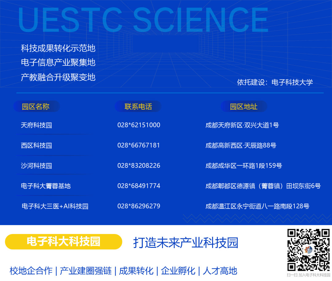 电子科大科技园积极围绕科技成果转化,形成了以电子信息为创新特色的示范园区,是科技人员、大学生创新创业的重要平台。