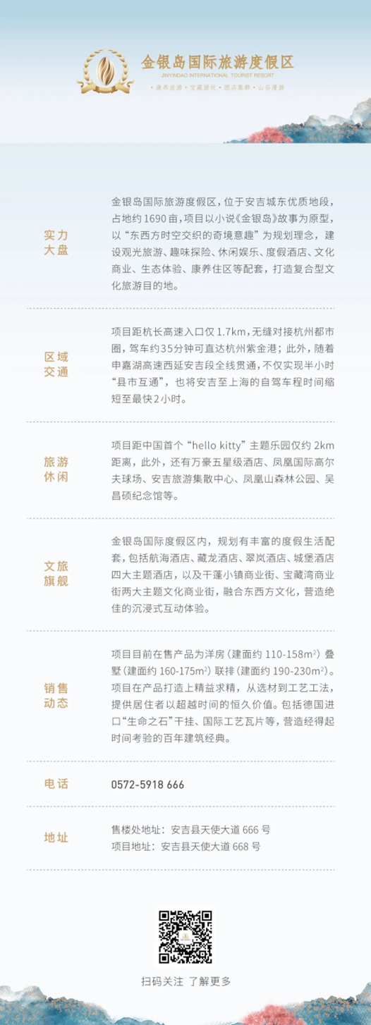本资料为要约邀请,不构成要约,买卖双方的权利义务最终以双方签订的《商品房买卖合同》及附件等协议为准。本宣传资料中对项目周边环境、交通、教育、商业及其他配套设施的介绍,皆在提供相关信息,并不意味本公司对此做出承诺,相关内容不排除因政府规划及开发商未能控制的原因而产生变化,本公司保留对资料修改的权利,敬请留意最新资料,法律规定范围内,浙江金银岛旅游开发有限公司享受解释权。“金银岛国际旅游度假区”为本案推广名。开发商:浙江金银岛旅游开发有限公司。(安)售许字(2022)第ZJ00043号。本资料发布时间:2023年9月,有效期1个月。本公司保留对本资料修改的权利,且不再另行通知。
