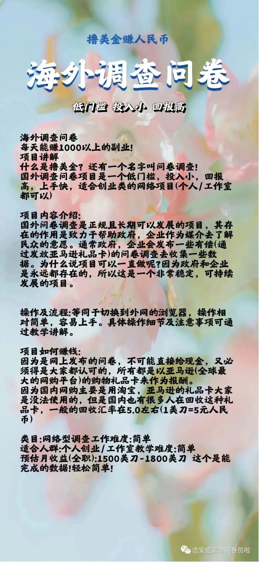 我们只需要通过安装搭建,使用国外的网络环境,模拟成他们本国的群众,去参与完成调研问卷。批量多开、操作答题,就可以批量赚取佣金,时间非常灵活,全天24小时可以答题操作简单,全程中文,只要有电脑操作基础的互联网小白都可以轻松上手操作,非常适合个人居家办公答题。也可以成立工作室,复制员工 批量操作 答题赚钱,成熟的团队还可以开展招商业务,把项目带给更多有需要的创业者。