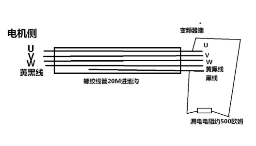 不管怎样,查!用万用表测这个黑线,对黄绿线绝缘,但对电机UVW线500欧姆!对照测量另一套设备的这个黑线,无论是对地或对电机的UVW线,都是绝缘!