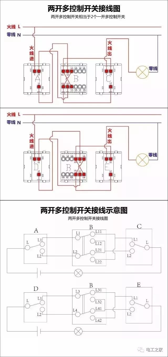 接线说明:两开多控制开关相当于2个1开多控制开关,(L1-L11-L12)与(L2-L21-L22)为一个多控制开关,(L3-L31-L32)与(L4-L41-L42)为一个多控制开关。