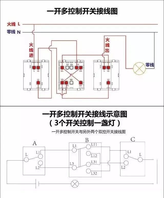 接线说明:火线先进双控开关A的L极,从开关A的L1出线连到多控制开关B的L1极,A开关的L2极出线连到多控制开关B的L3极。多控制开关的L11极和L32极串起来,L12和L31串起来。再从B开关的L11(或L32)出线连到双控开关C的L1极,从多控制开关B的L12(或L31)出线连到双控开关C的L2极,双控开关C的L极出线作为灯泡的火线,这样就完成接线了。