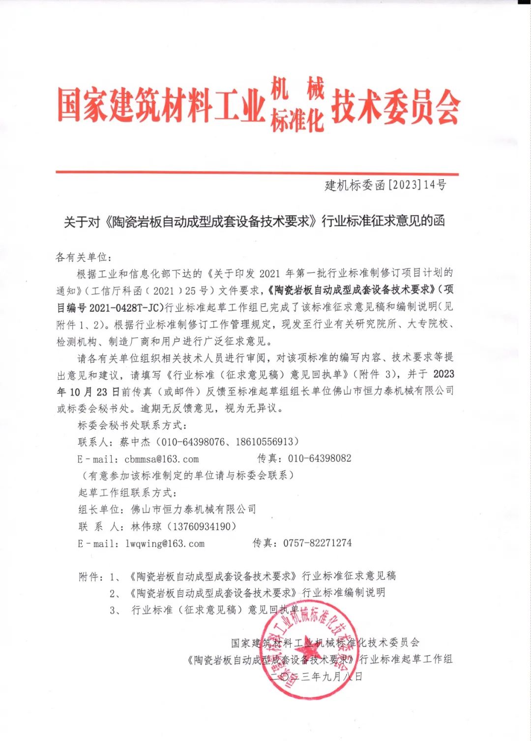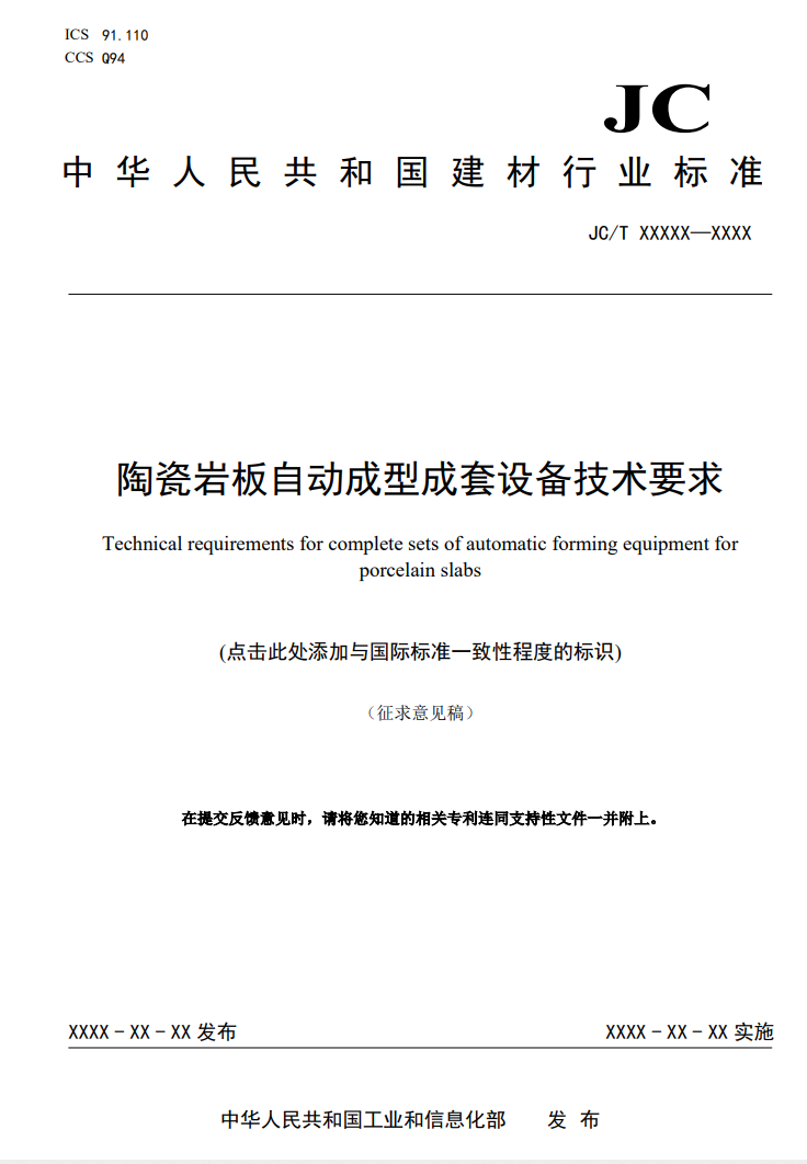国家建筑材料工业机械标准化技术委员会发布通知,对《陶瓷岩板自动成型成套设备技术要求》(项目编号2021-0428T-JC)行业标准项目征求意见。如有意见,请尽快反馈。