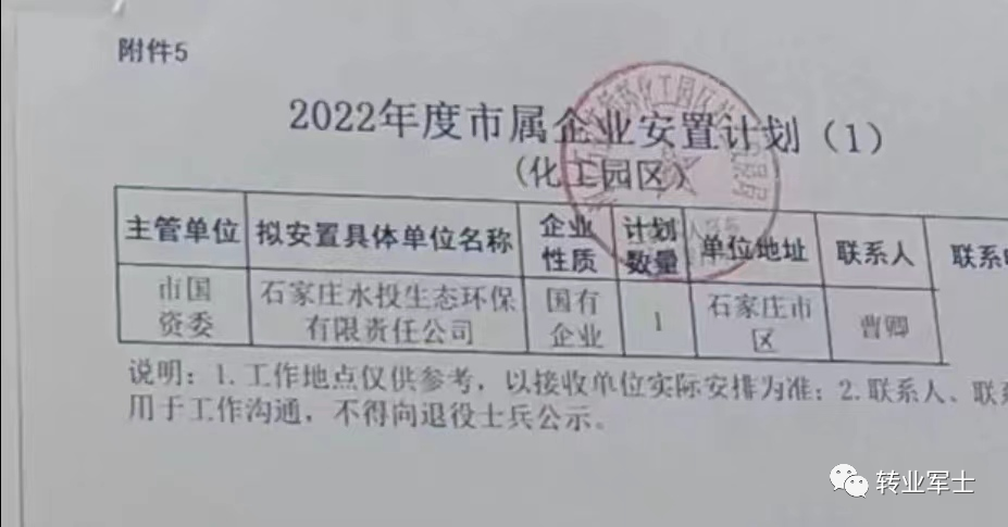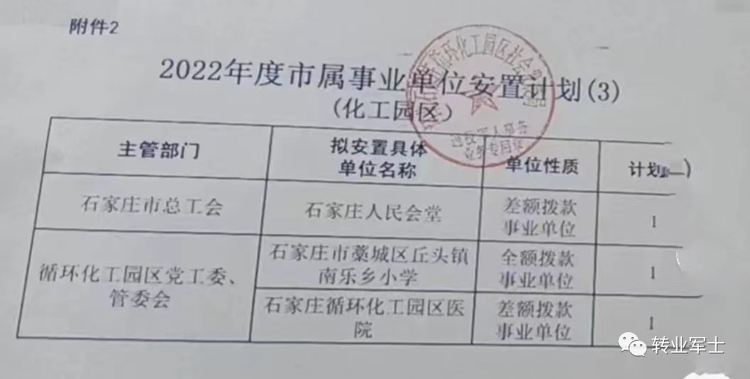 【河北省石家庄市化工园区】2022年度转业军士安置岗位公示