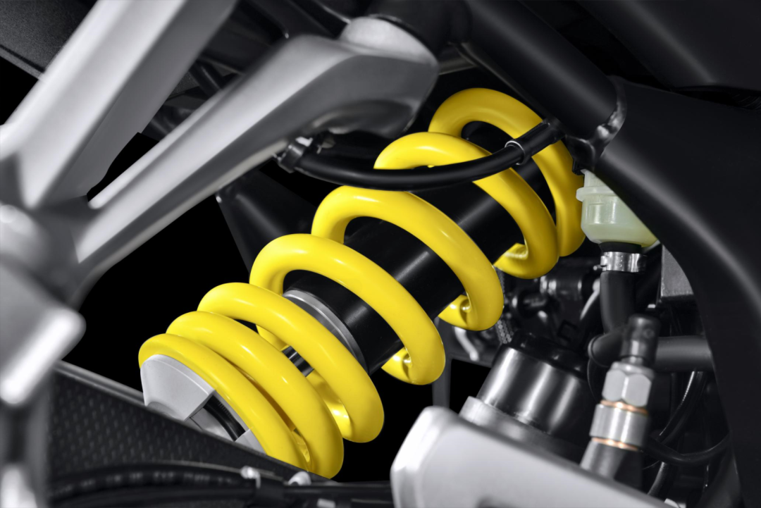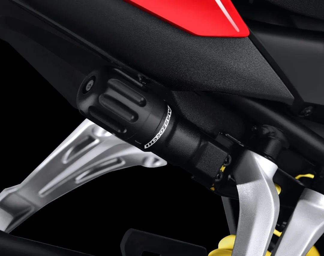 后减震也是使用的马祖奇,带旋钮调节,采用的是中置减震的布局,乘客脚踏目测也是铝合金的材质。