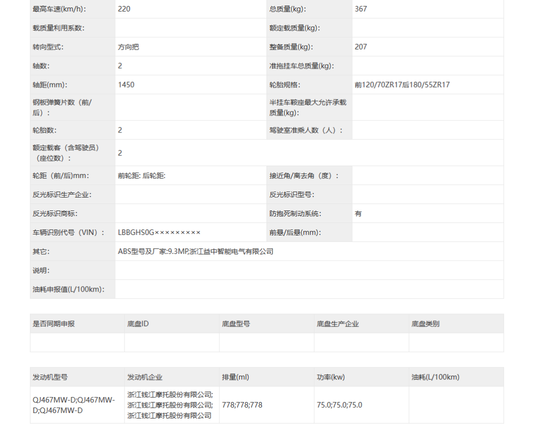 先来回顾下工信部赛800的几个重要数据数据:最高时速220KM/h,整备质量207公斤,轴距1450,前轮120/70ZR17后轮180/88ZR17,发动机排气量778CC,最大功率75Kw。