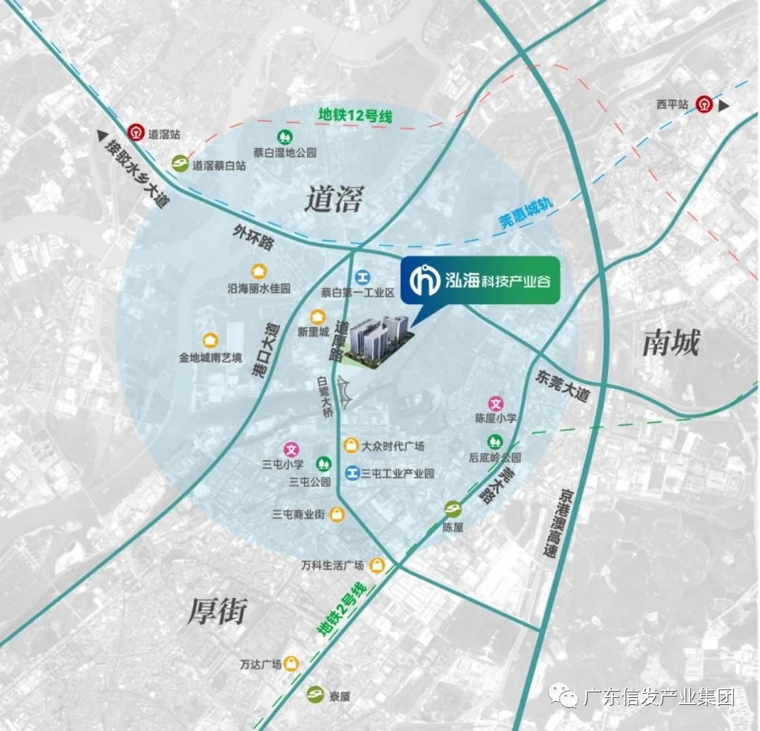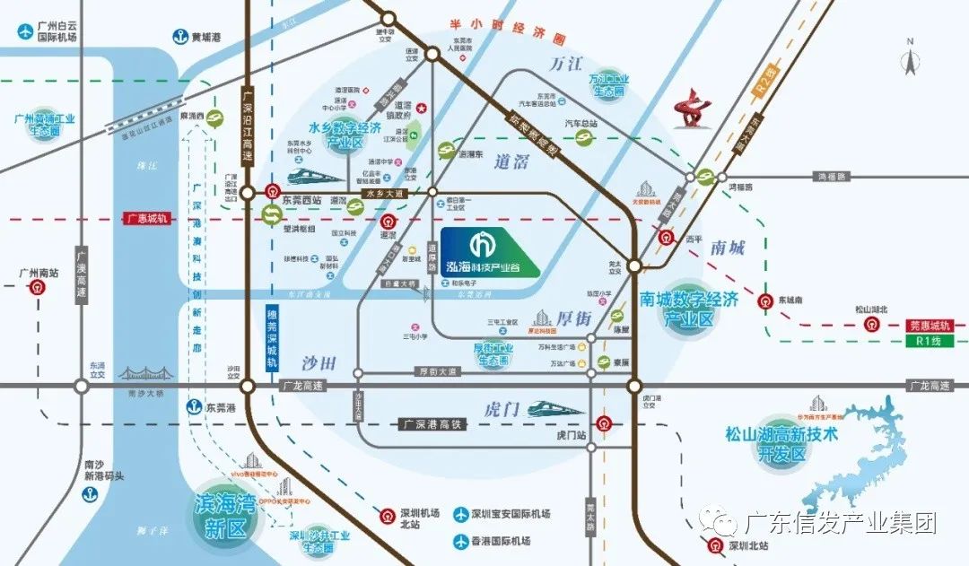 作为水乡首站,多轨对接深广,水陆交通路网发达。泓海科技产业谷,近享港口大道与外环路交汇便捷,可快速接驳水乡大道、东莞大道、京港澳高速、地铁2号线、莞惠城轨等,而且规划中的东莞地铁12号线规划预留道滘蔡白站,1站到南城,快捷畅融湾区1小时经济圈。