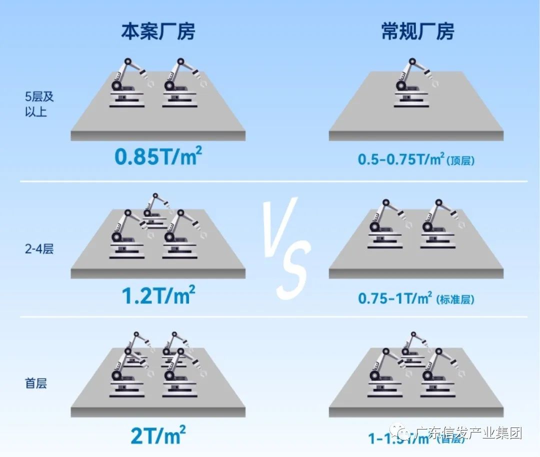 1#、2#、3#首层2T/㎡,2-4层1.2T/㎡,5-11层850KG/㎡;4#首层1.2T/㎡,2-13层850KG/㎡,可满足制造企业开展各类大型生产与研试, 堪称产研展贸一体全能空间。