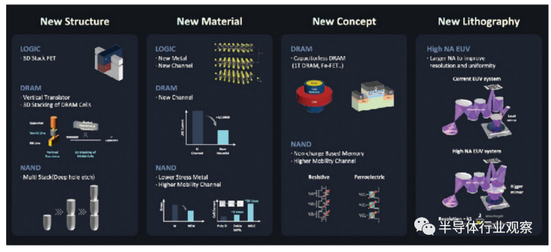 在NAND方面,多堆栈等技术将继续发展。“需要新材料来克服机械应力或传感裕度。为了进一步缩小单位器件尺寸,需要能够降低工作电压的器件开发新概念。” “为了提高 EUV 的分辨率和均匀性,还需要使用更大镜子的高数值孔径 EUV 技术。”