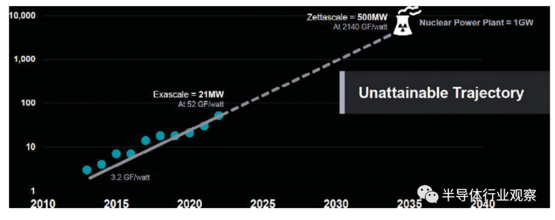 AMD 执行副总裁和CTO Matk Papermaster 指出,如果我们保持相同的步伐,超级计算机安装所需的电力将接近核电站的电力(图 3)。“这是一个非常可怕的数据点,它真正告诉你的是我们正在达到能源消耗的绝对极限,”他说。
