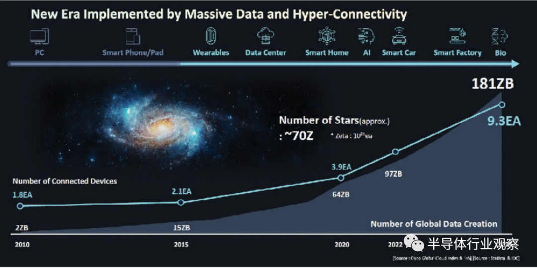 了解半导体需求最有用的方法之一是生成的数据量,当然必须收集、分析这些数据并采取行动。“每年产生的数据量呈爆炸式增长,”三星电子设备解决方案业务部的公司总裁兼首席技术官Jaihyuk Song说。““它是太空科学家目前估计的整个宇宙恒星数量的两倍半以上。”