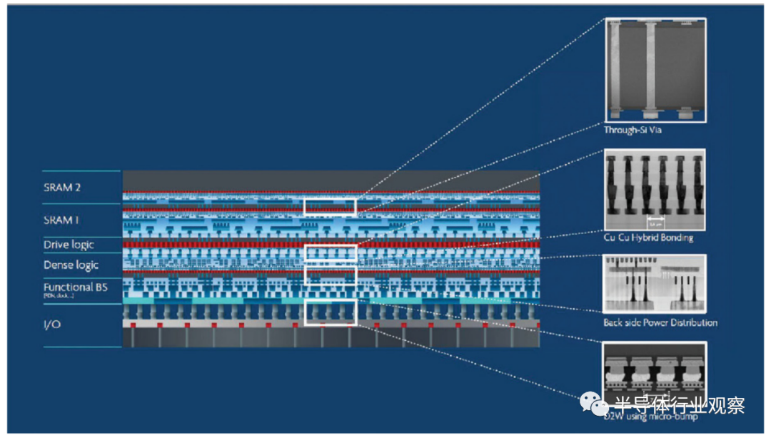 如今,DRAM 存储器通常构建为 3D 层堆栈,而核心处理器chiplet则使用单个芯片(单片 2D 芯片系统)制造。“实现异构集成的下一个方法是将先进的 2D 处理器芯片构建为 3D 层堆栈,将功能划分为多个层。这可以通过使用先进的晶圆堆叠技术来完成,例如使用硅通孔技术、铜对铜混合键合,从而在逻辑层和内存缓存层之间实现非常高密度的互连,”Van den hove 说。图 5 说明了这在实践中的情况。