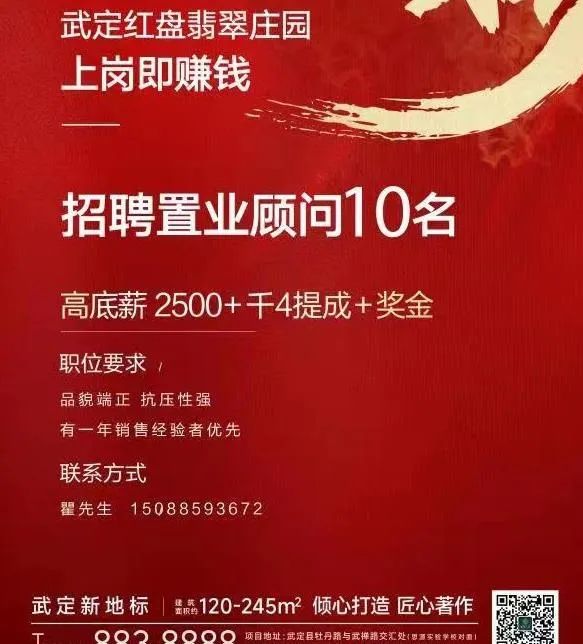 武定翡翠庄园招聘:置业顾问,要求:品貌端正,抗压性强,有一年的销售经验者优先,电话:15096498984,微信同号。地址:武定湿地公园翡翠庄园二期1栋商铺。