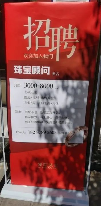 武定爱恋珠宝,中国黄金,招聘销售顾问5名 任职要求:1、男女不限,(年龄20岁以上) 性格活泼开朗。2、有亲和力,积极上进。3、有无经验皆可,带薪培训上岗。福利待遇:1、3000-8000上不封顶。2、上半天休半天 3、5天年假+工龄工资+月假