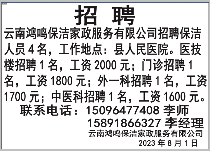 ▼【全职招聘】单位名称:武定鸿鸣保洁有限公司