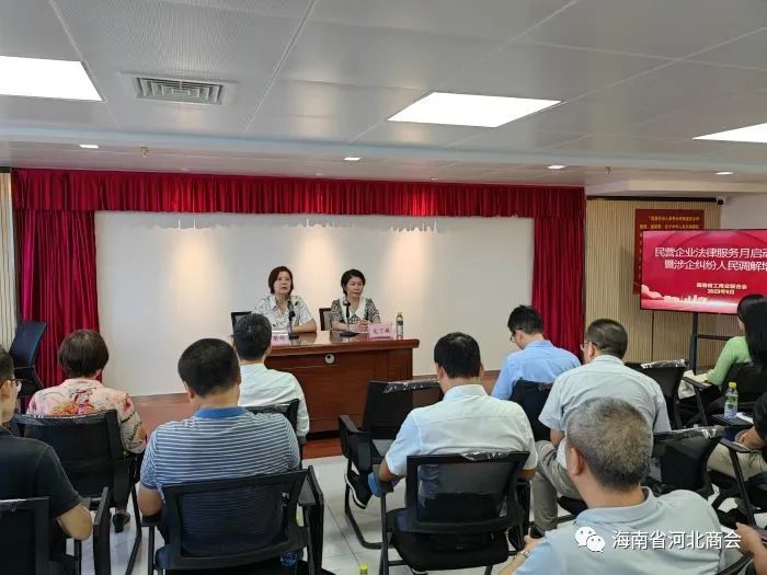 日,海南省工商联在海口市举办民营企业法律服务月启动仪式暨涉企纠纷人民调解培训。海南省工商联专职副主席龙丁敏出席会议,省工商联法律维权处一级调研员翟慧玲主持会议。参加本次会议的有海南省律师协会、海南省劳动人事争议仲裁院、海口市工商联以及部分省级异地商会代表。我会执行秘书长周敬涛参加会议。