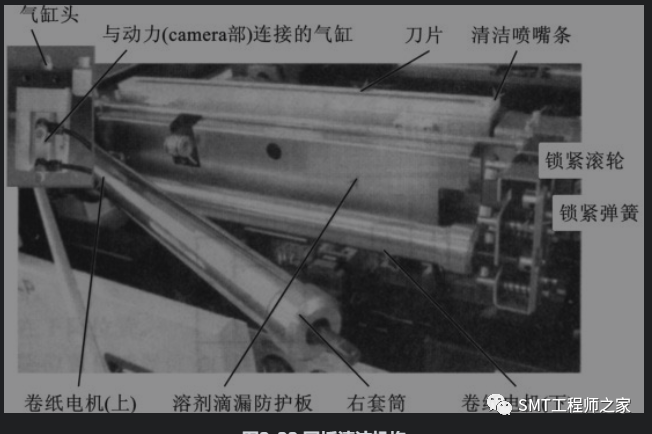 网板清洁机构由光电传感器、气缸、滚筒电机、卷纸、清洁吸嘴等组成,如下图所示。其作用是清除网板背面粘连的锡膏。