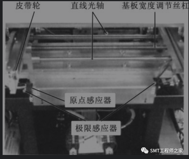 基板传送机构的传送采用电机驱动、皮带轮传送和自动调节导轨宽度的传送方式,基板传送机构如下图所示。基板传送机构影响轨道宽度的调节和基板的传送状况,其原点传感器和极限传感器分别起到了限制轨道调节最小宽度和轨道调节最大宽度的作用。