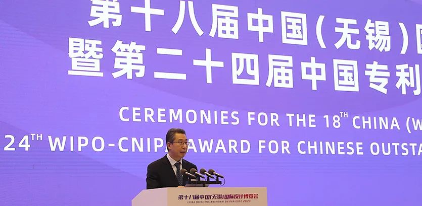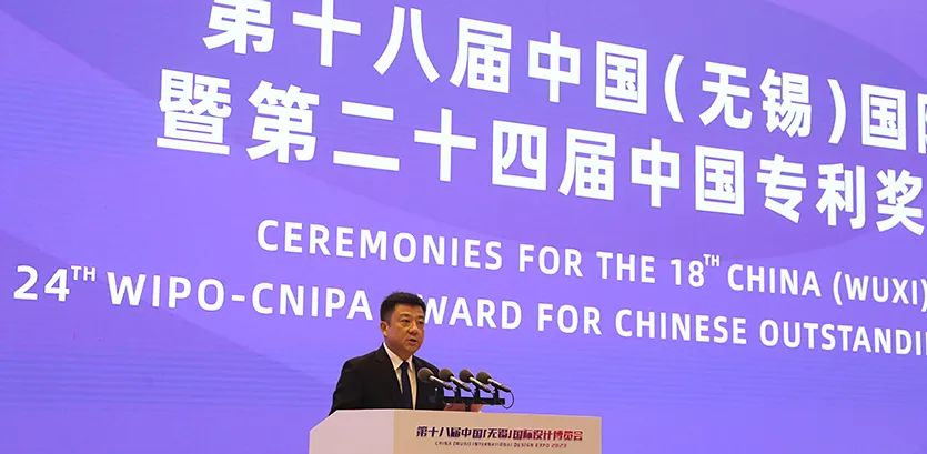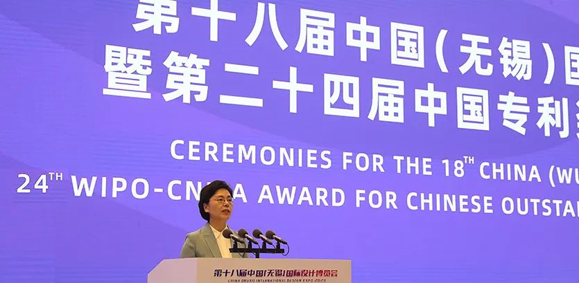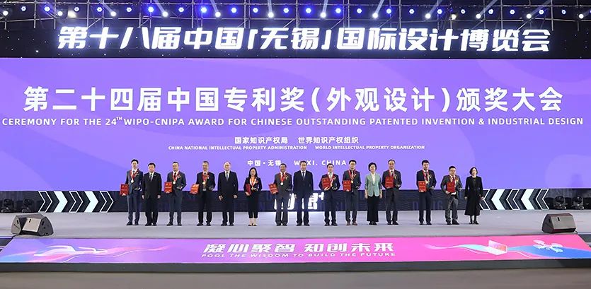 9月9日,由国家知识产权局、科技部、江苏省人民政府共同主办的第十八届中国(无锡)国际设计博览会于江苏省无锡市太湖国际博览中心盛大开幕,第二十四届中国外观设计金奖在开幕式上颁发。国家知识产权局局长申长雨、江苏省人民政府副省长徐缨、无锡市委书记杜小刚出席开幕式并致辞。世界知识产权组织(WIPO)总干事邓鸿森通过视频向大会致辞。国家知识产权局副局长卢鹏起宣读第二十四届中国专利奖(外观设计)授奖决定。开幕式由无锡市人民政府副市长周文栋主持。