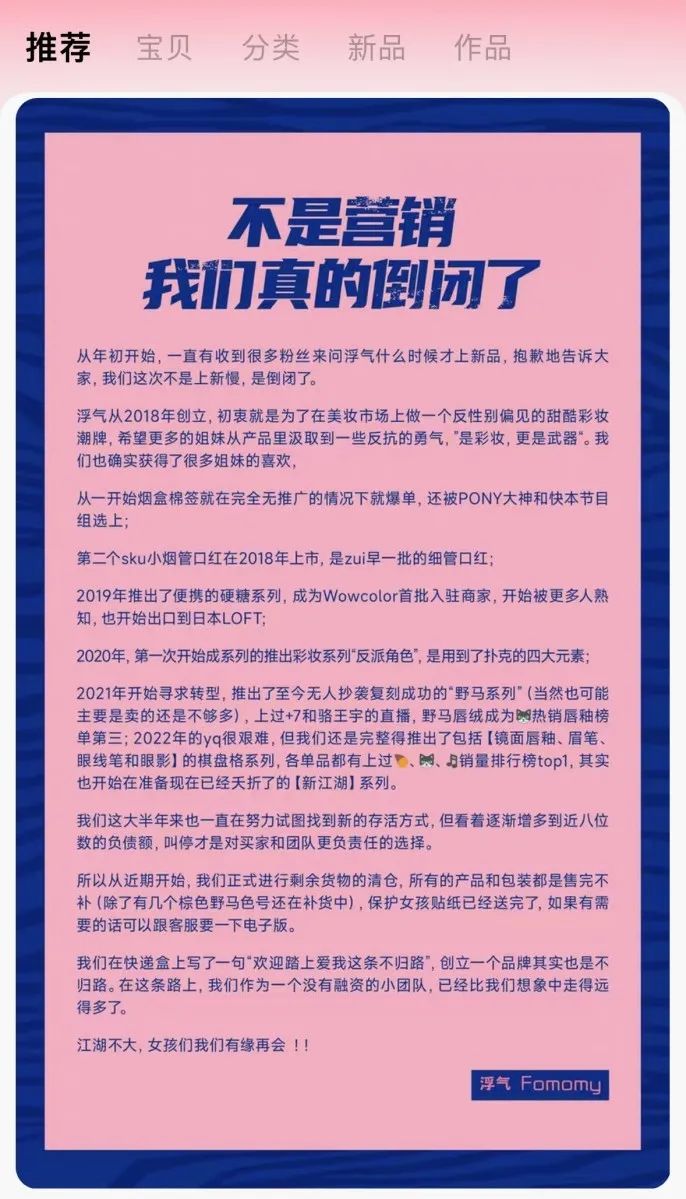 浮气Fomomy在某电商平台发布了这样一则公告——《不是营销,我们真的倒闭了》,公告中浮气Fomomy向消费者说明了清仓倒闭的原因。