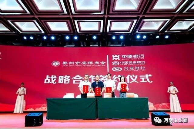 在会议现场,郑州市安阳商会与中原银行郑州分行、中国民生银行郑州分行、兴业银行黄河南路支行等金融机构,与中冶天工河南分公司、中建二局中原分公司等央企,与河南广播电视台国际频道签订战略合作协议,并为商会会员单位进行授牌。其中,中原银行郑州分行、民生银行郑州分行、兴业银行黄河路支行和郑州市安阳商会签署了总授信68亿元的战略框架合作协议。