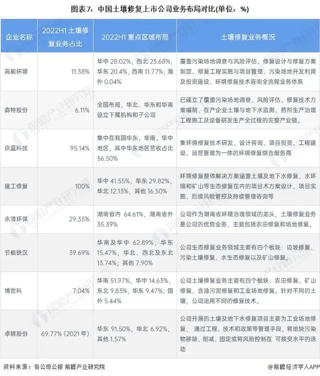 上市公司是土壤修复行业内发展较为成熟的一批企业,在业务布局方面,大多数企业已形成从污染地调查评估、修复工程、项目管理等全链条的业务能力。从企业业务布局来看,京蓝科技、建工修复和卓锦股份等企业土壤修复业务占比较高,超过60%,而高能环境在固废处理领域、森特股份在金属围护系统领域的布局更广,因此土壤修复业务占比相对较小。区域布局方面,大部分企业均在国内开展业务,且土壤修复行业具有一定的地域特征,如永清环保作为湖南省环境治理龙头企业,湖南省内业务营收占比超过60%。