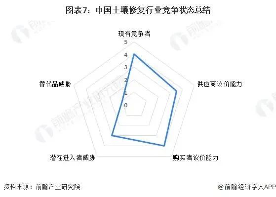 从五力模型来看,土壤修复行业上游包括相关药剂和设备的研发设计、药剂生产商、设备供应商及土壤污染检测商等,产品专用性较强,议价能力强;行业下游有政府部门、环保局等单位,议价能力较强;国家层面将继续保持对环保行业的政策支持,这对新进入者的吸引力较强;行业目前处于成长期,仍有一定的发展空间,行业现有竞争相对激烈;土地作为陆地生态系统重要组成部分,是人类和动物居住不可替代的环境因子,难以有更好的替代方案,故替代品威胁较小。根据以上分析,对各方面的竞争情况进行量化,5代表最大,1代表最小,目前我国土壤修复行业五力竞争总结如下: