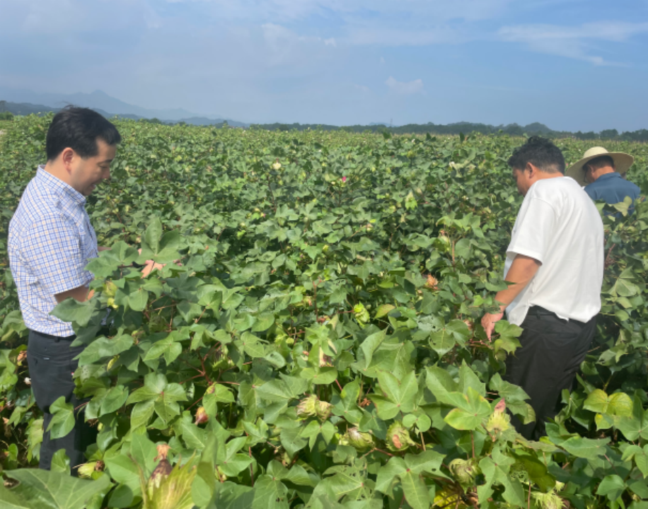 9月4日,江西省棉花技术产业体系经济专家,江西农业大学博士生导师刘滨教授一行前往江西省九江市武宁县中共船滩镇仑上村,就国审棉新品种“赣棉15号”良繁基地300亩调研,调研旨在总结经验、发现问题、提出对策,进一步推动江西省棉花产业的发展。