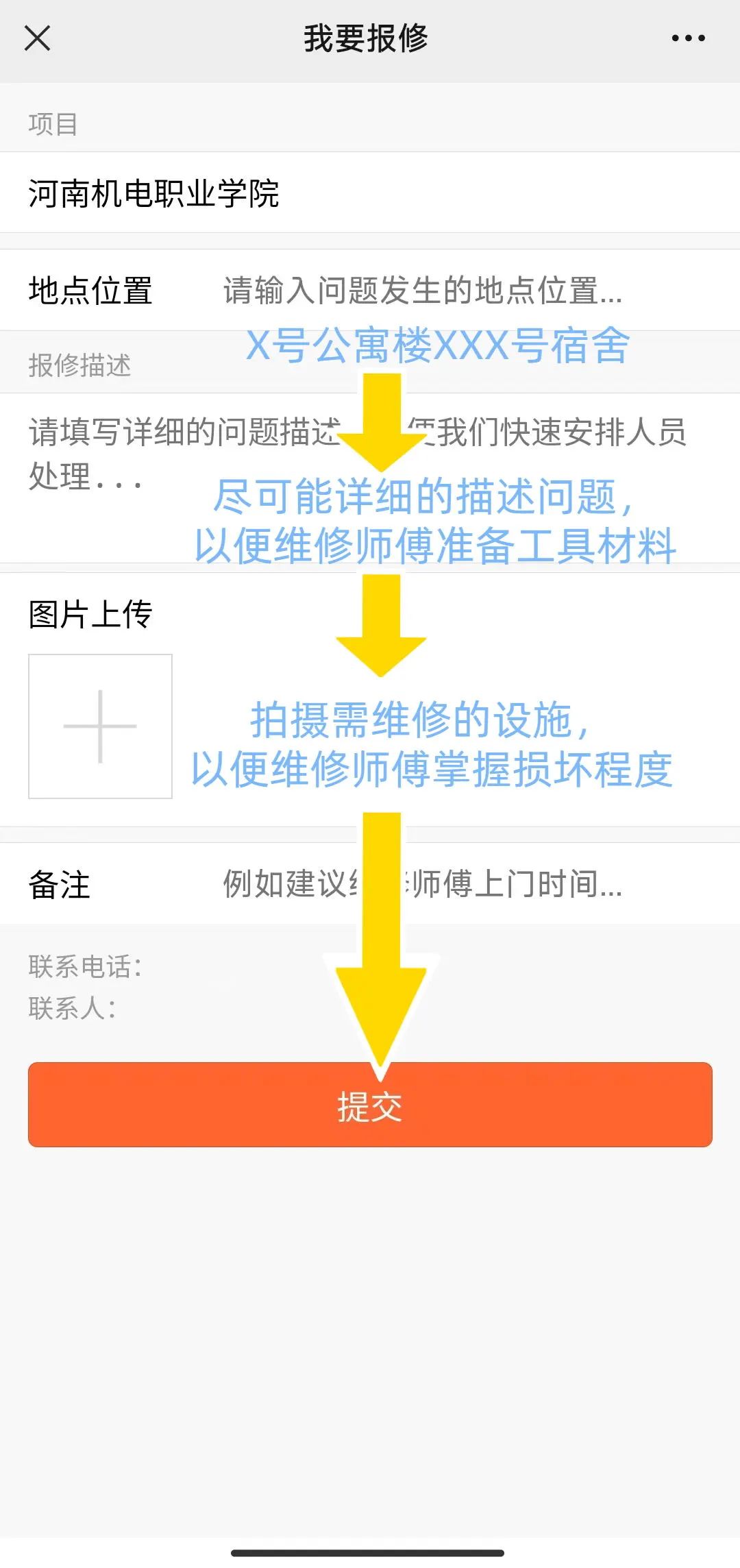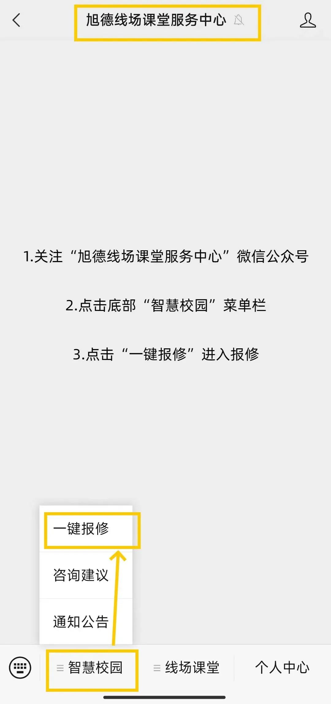 校内维修由旭德线场课堂服务中心负责,如遇宿舍设施设备损坏(床桌、水管、电灯、门窗、便池、面盆等),请关注“旭德线场课堂服务中心”微信公众号一键报修,如情况紧急也可直接拔打维修电话:0371-85901069,报修流程如下: