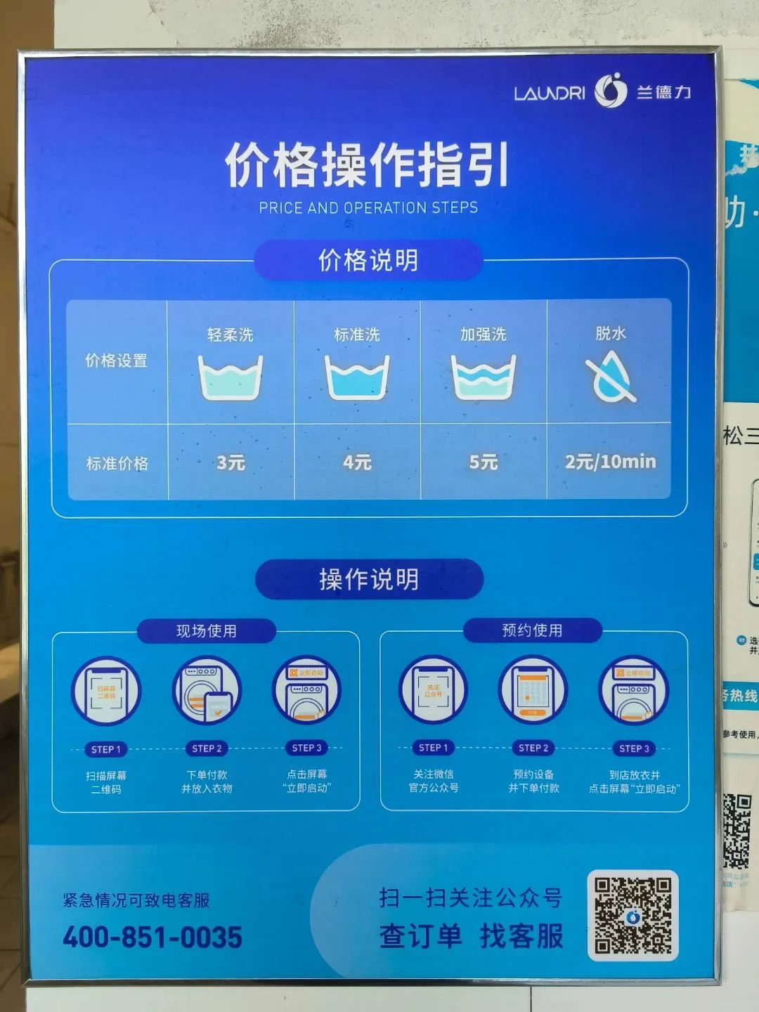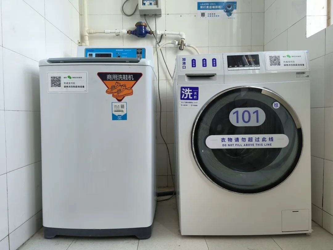 公寓楼内每层配备有1-2台洗衣机,位于公共洗漱间;每栋公寓楼配备有1台洗鞋机,位于楼内一或二层公共洗漱间。洗衣机旁张贴有收费标准,机身上有二维码,使用微信或支付宝扫码后即可使用。
