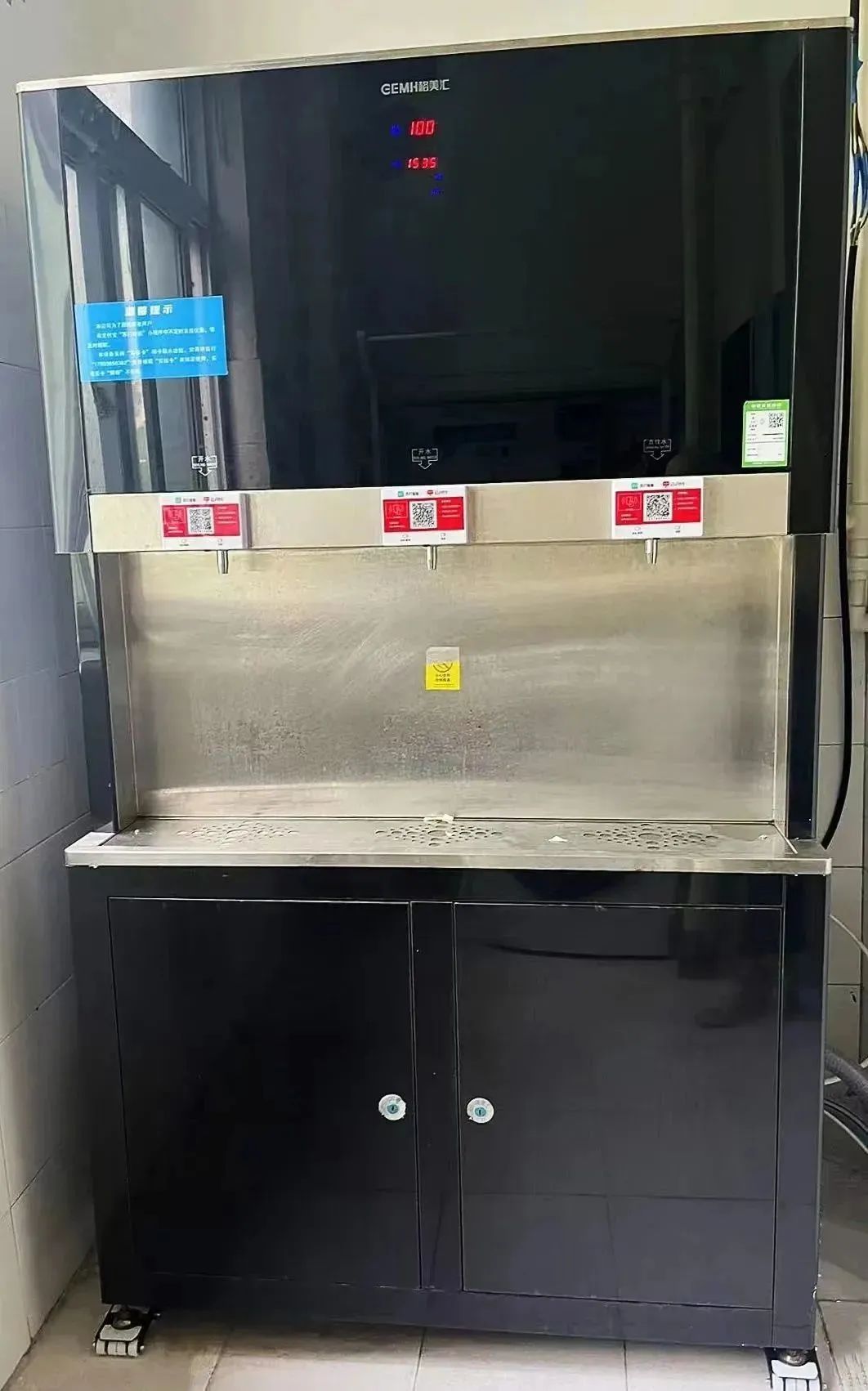 每栋公寓楼内都配备有直饮水机,位于每一层的公共洗漱间,直饮水机身上贴有使用方法和二维码,同学们使用支付宝扫码后便可接水饮用。