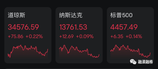 截至收盘,道指涨0.22%报34576.59点,标普500指数涨0.14%报4457.49点,纳指涨0.09%报13761.53点。