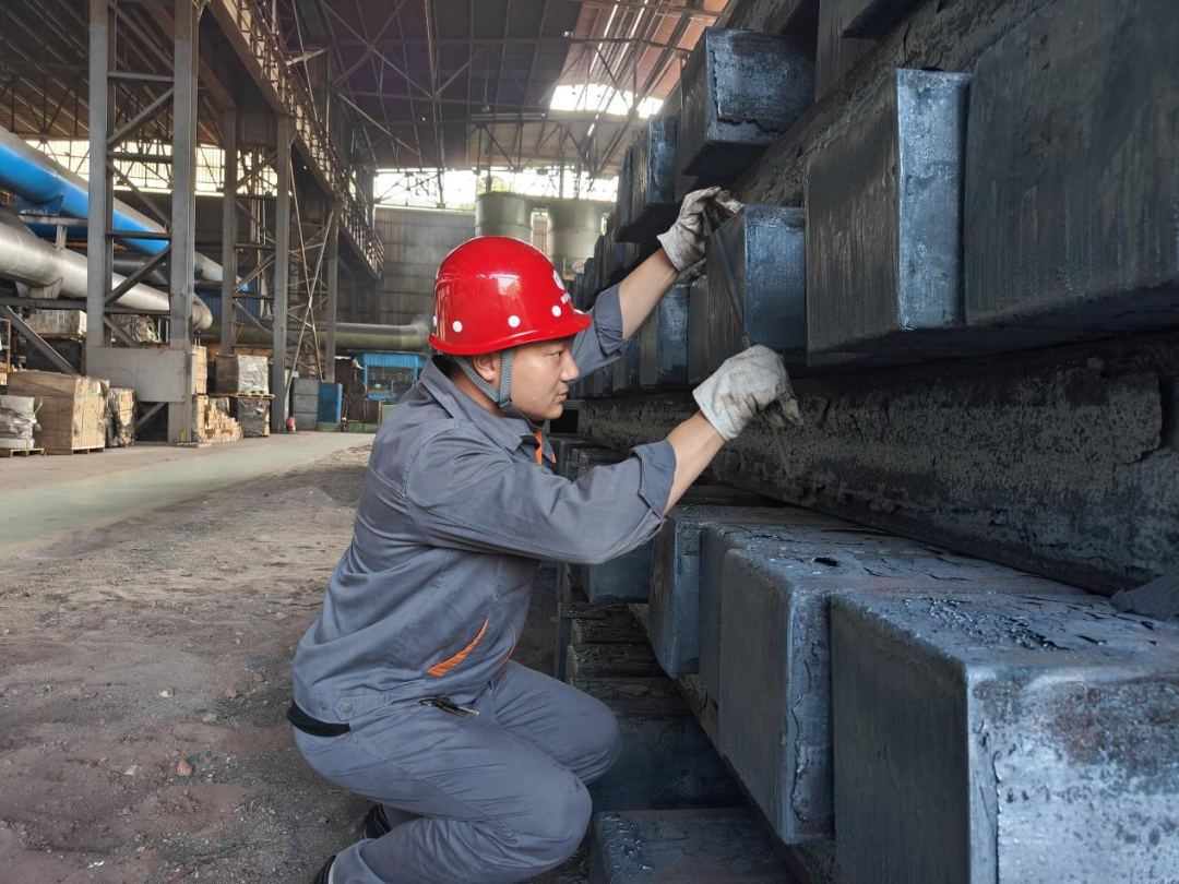 兴华轧钢厂始终严格按照质量管理相关规定对全线各处关键点进行质量验收及管控。要想轧制出质量达标,令客户满意的钢材,钢坯的验收合格与否是首要一步,靳国杰作为质量小组组长,他每天上班都要结合加热炉岗位员工,去原料库里走一走,看一看,量一量,走进库内看一看钢坯的外观质量是否达标,量一量钢坯的尺寸、重量是否在允许偏差内,直到完全符合质量管理规定才能入炉。