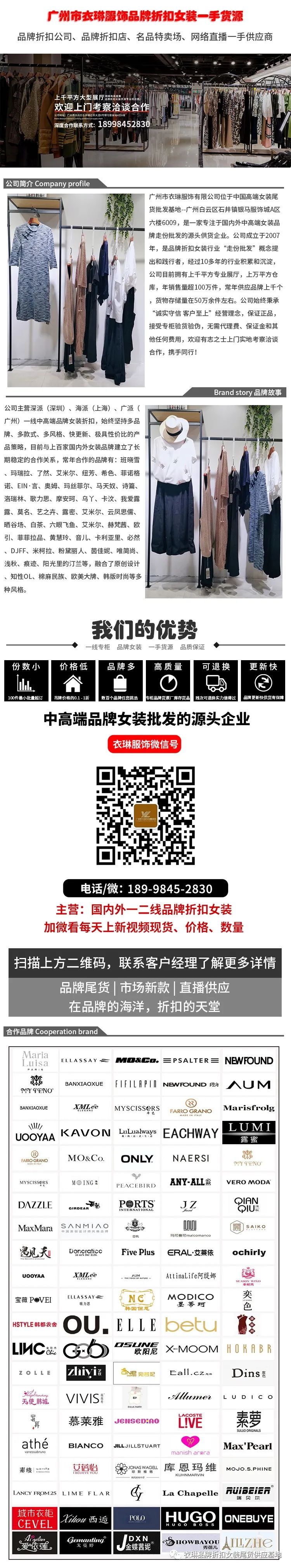 温馨提示:以上就是“品牌女装尾货怎么找物美价廉的货源”内容的大致介绍,衣琳服饰是一家专注于国内外中高端女装品牌走份批发的源头供应企业,主营深派(深圳)、海派(上海)、广派(广州)一线中高端品牌女装折扣,常年合作的品牌有:班晓雪、玛瑞拉、了然、艾米尔、纽芳、希色、菲诺格诺、EIN·言、奥姆、玛丝菲尔、马天奴、诗篇、洛瑞林、歌力思、摩安珂、乌丫、卡汶、我爱露露、莫名、艺之卉、露密、云凤思儒、晒谷场、白茶、六眼飞鱼、赫梵茜、欧引、菲菲拉品、黄慧玲、音儿、卡利亚里、必然、DJFF、米柯拉、粉黛丽人、茵佳妮、唯简尚、浅秋、痕迹、阳光里的汀兰等,融合了原创设计、知性OL、棉麻民族、欧美大牌、韩版时尚等多种风格;找品牌女装尾货货源上衣琳服饰。衣琳服饰专注一二线中高端女装走份批发不代发,不零售,不挑款。关注 18998452830 支持视频看货,定金发货,一手品牌女装尾货货源