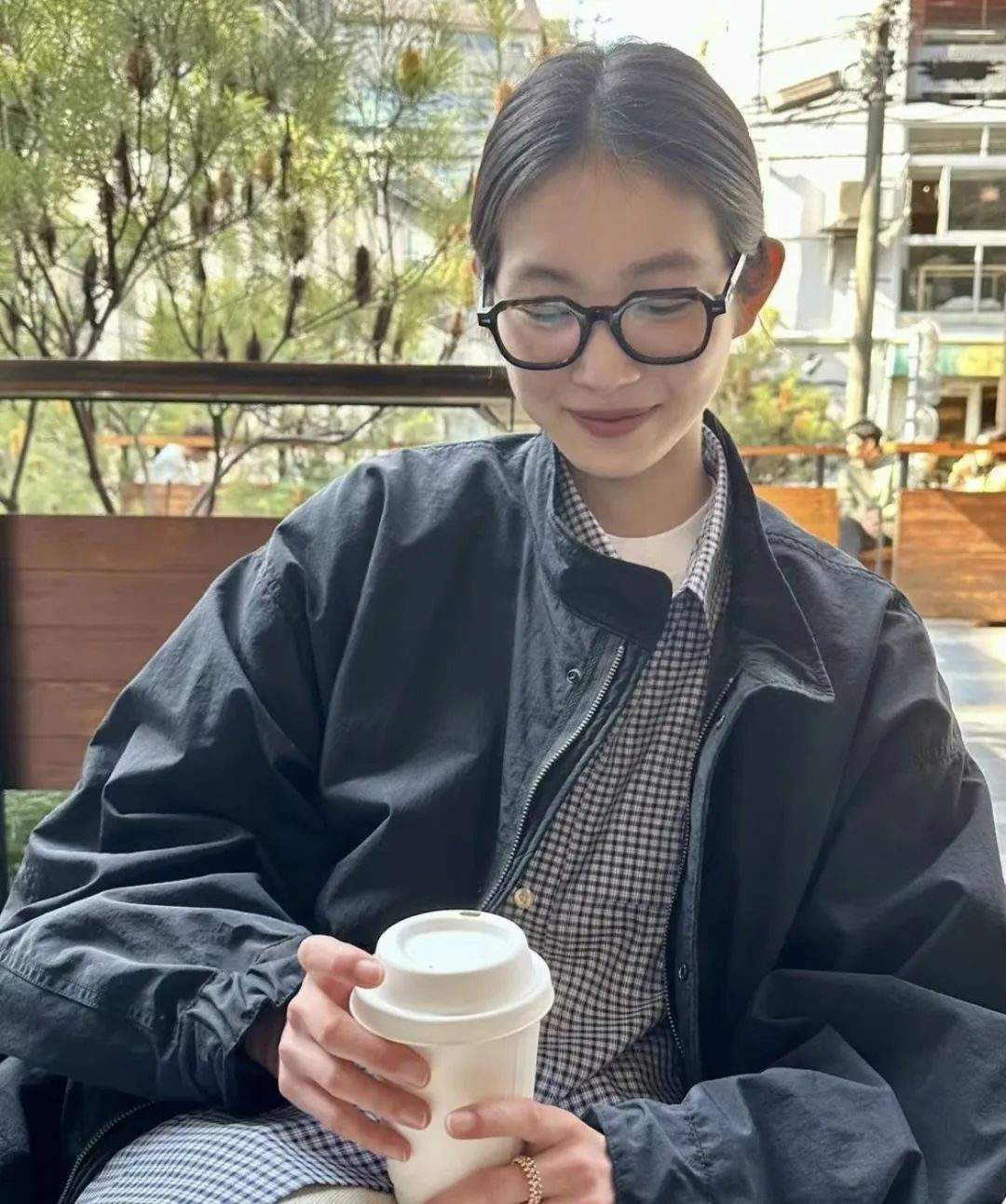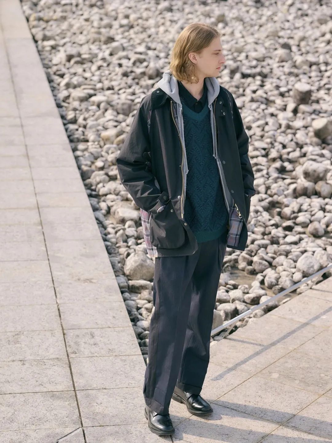 如果感觉黑色会过于沉闷的话,试试把袖口翻起来,露出里面的格纹内里,另外加一顶帽子,就可以很韩了
