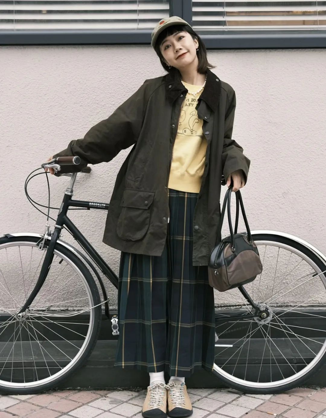 绿色的外套配绿格纹半裙,复古日系,可可爱爱又不会显得太幼稚
