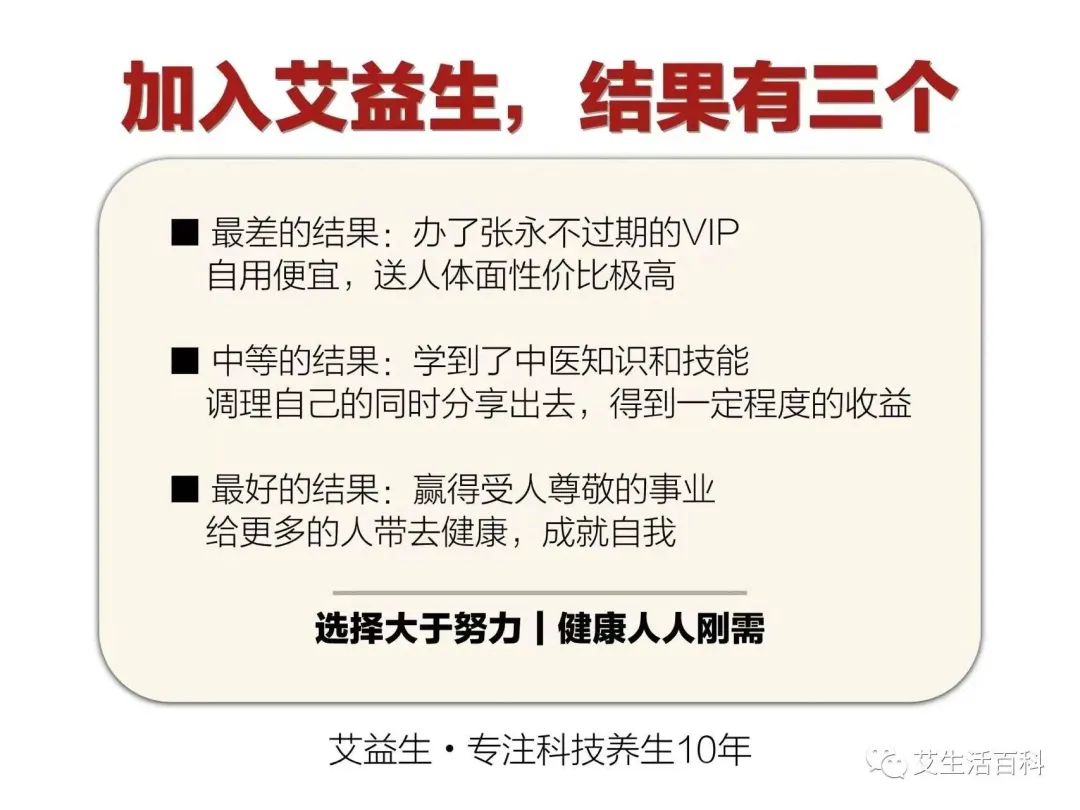 1、最差的结果:就是办了张11900元的VIP健康养生卡,长期免费学习中医专业知识,自用产品更划算,分享给亲戚朋友,传递健康的同时挣点零花钱。